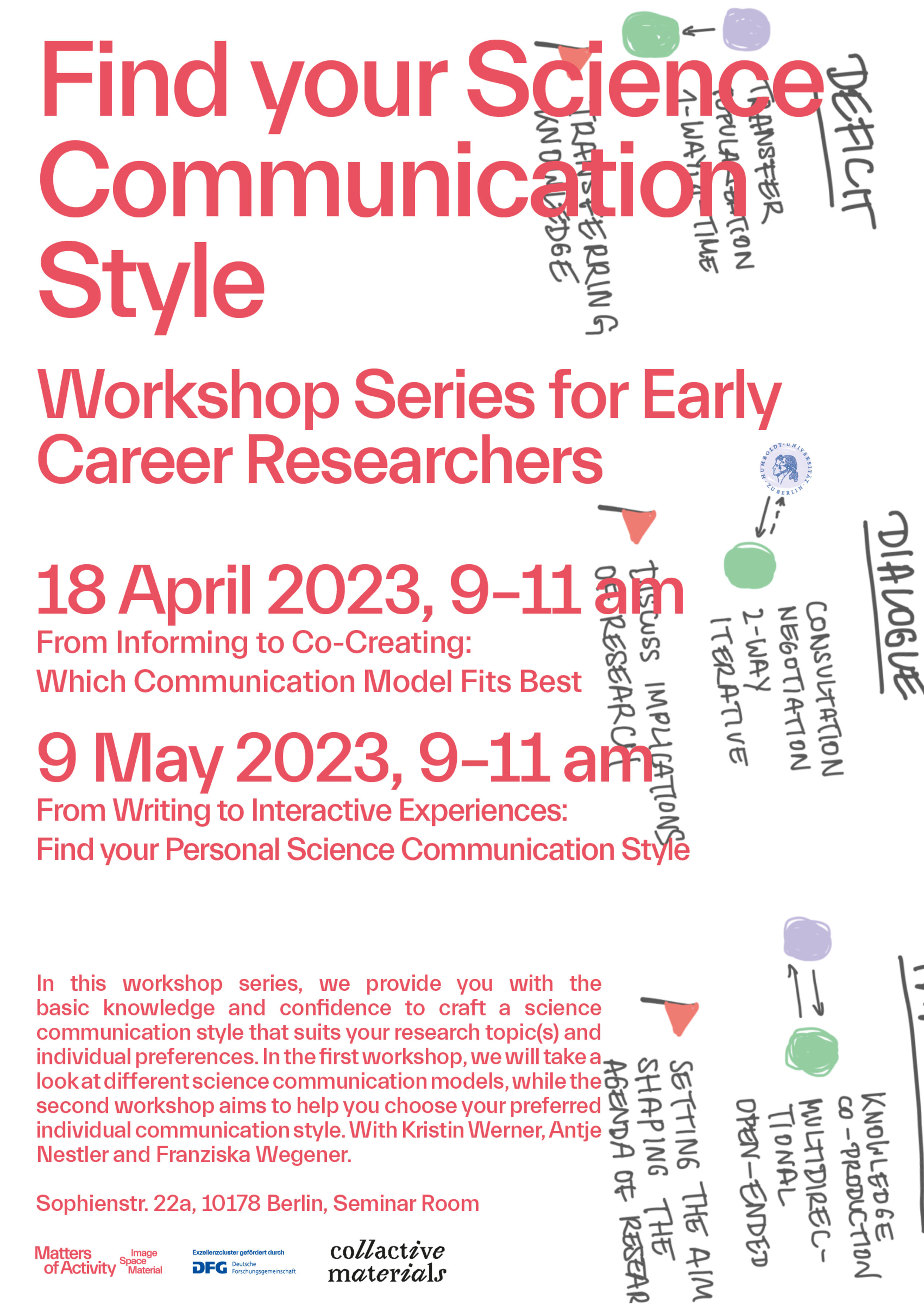As science communication becomes an increasingly important part of any researcher’s life, it is essential - especially for PhDs and Postdocs - to find a science communication style that engages your audience(s) in a meaningful way while also providing enjoyment and mental energy for your own research. In this mini workshop series, we provide you with the basic knowledge and confidence to craft a science communication style that suits your research topic(s) and individual preferences. In the first workshop, we will take a look at different science communication models, while the second workshop aims to help you choose your preferred individual communication style. Additionally a media presence training will be offered as a third activity.