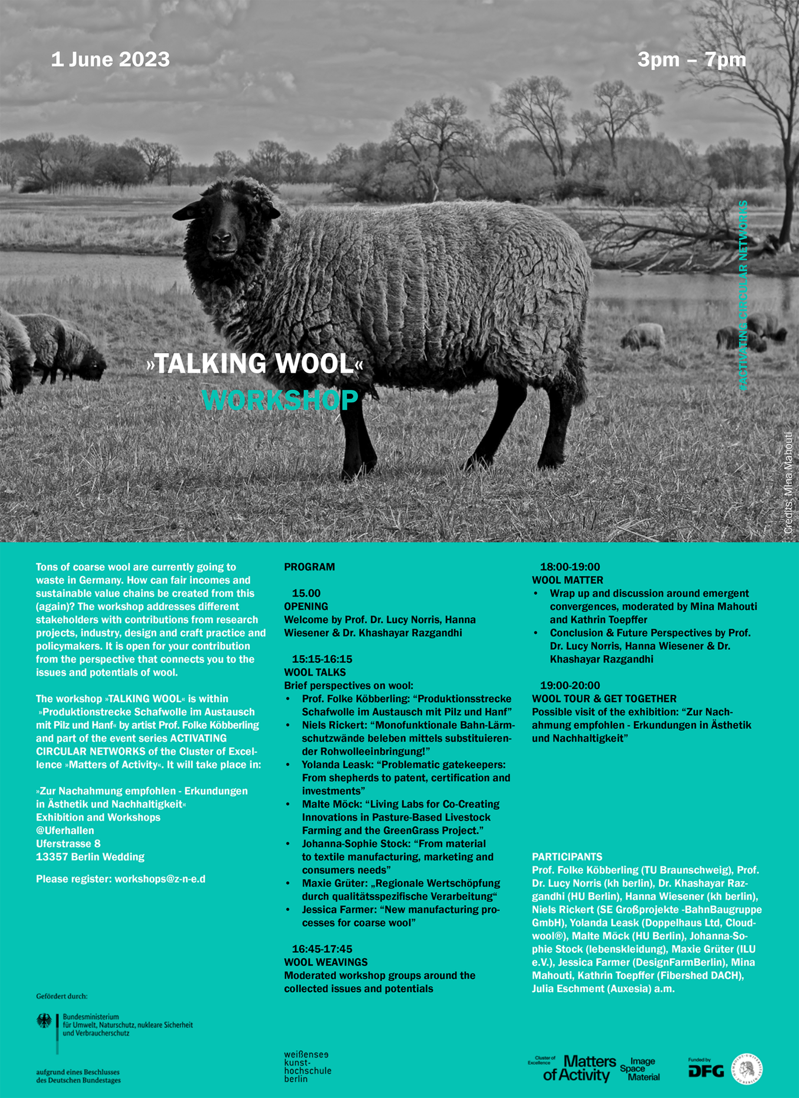 Local, natural fibres, are some of our most sustainable raw materials. Yet since the discovery of fossil fuels and the invention of plastics, fibres like wool have lost value and importance. Nowadays just 1% of new textiles for fashion are made from wool, however, this is still one of the few natural fibres we can grow in Northern Europe. As part of the new ›Activating Circular Networks‹ event series, the Cluster of Excellence »Matters of Activity« will host »Talking Wool« on June 1st, 2023, from 3 to 7 pm, at the Uferhallen in Wedding - an event that brings designers, academics, politicians, and farmers together to discuss the issues surrounding European and local German wool, the problem of wool waste in particular, and fibre security.