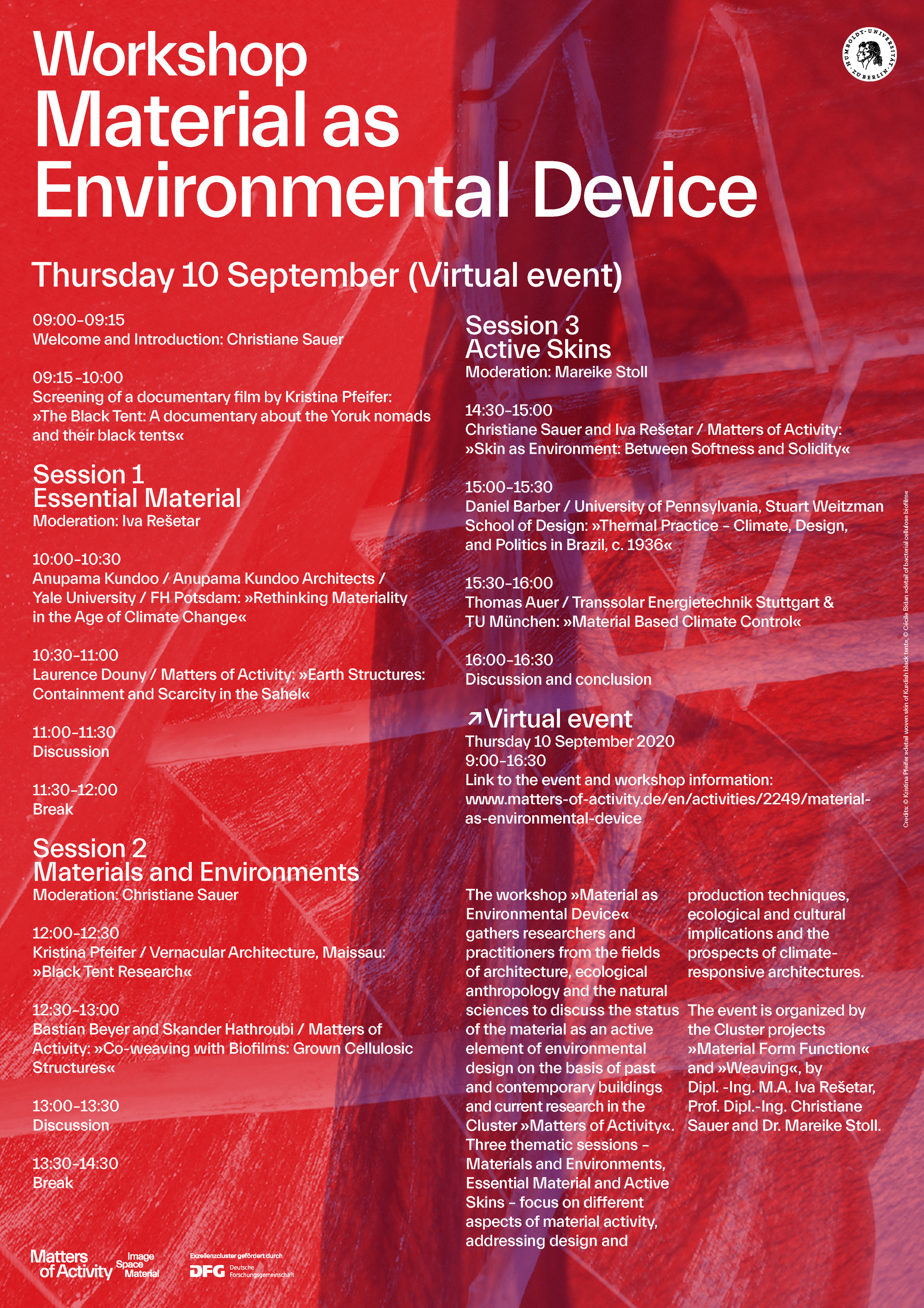 The workshop »Material as Environmental Device« gathers researchers and practitioners from the fields of Architecture, Ecological Anthropology and the Natural Sciences to discuss the status of the material as an active element of environmental design on the basis of past and contemporary buildings and current research in the Cluster »Matters of Activity«. Three thematic sessions – »Materials and Environments«, »Essential Material« and »Active Skins« – focus on different aspects of material activity, addressing design and production techniques, ecological and cultural implications and the prospects of climate-responsive architectures.