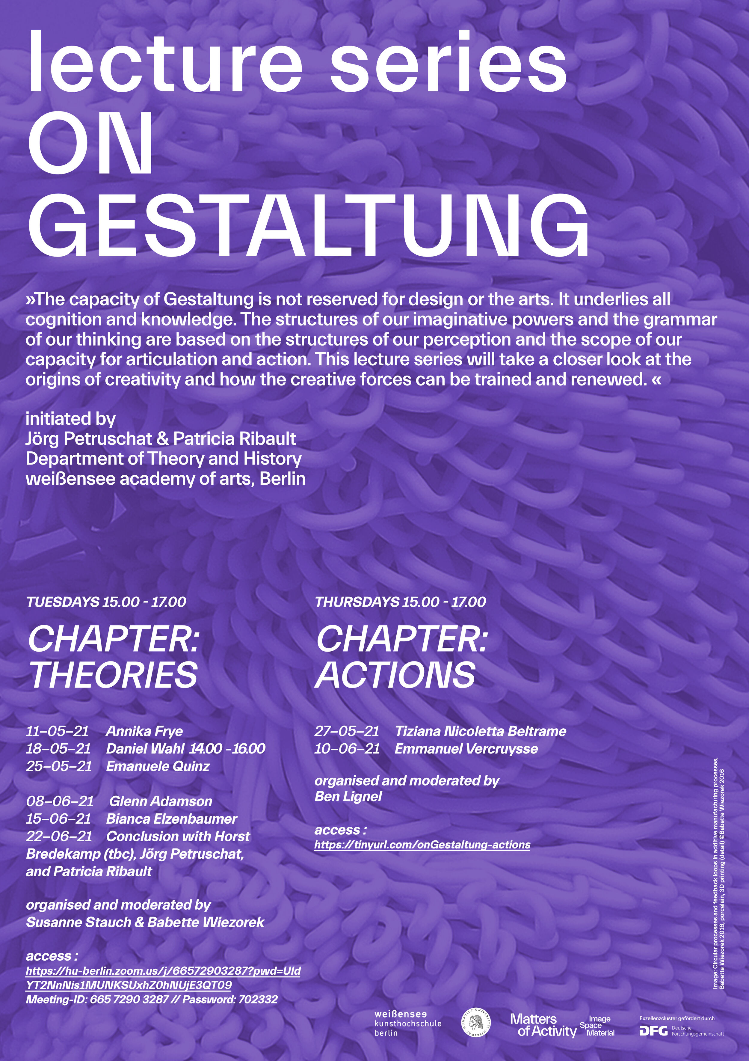On Tuesday, May 11th 2021, started »On Gestaltung«, a new online lecture series initiated by the Cluster members Jörg Petruschat and Patricia Ribault at weißensee school of art and design berlin. This lecture series was conceived in two parts: »Theories«, which complemented Jörg Petruschat’s seminar »Theories of Gestaltung«, and »Actions«, which was an extension of Ben Lignel’s seminar »Performing Research: Being with / Learning with / Speaking with an Object«.