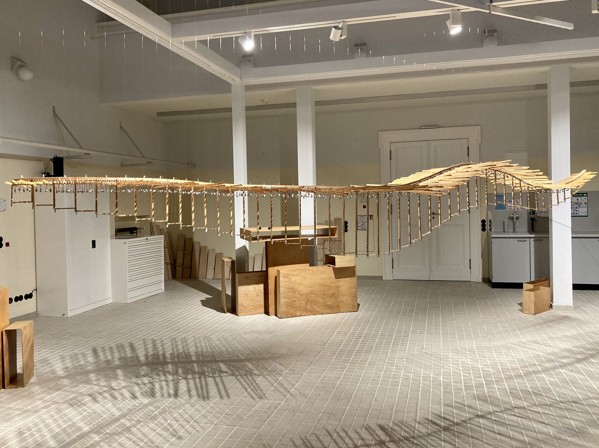 The sculpture consists of more than four thousand individual parts, which were each cut, filed, drilled, punched, and painted several times by hand from ash and pinewood, as well as horsehair, lead weights, and aluminum connections.