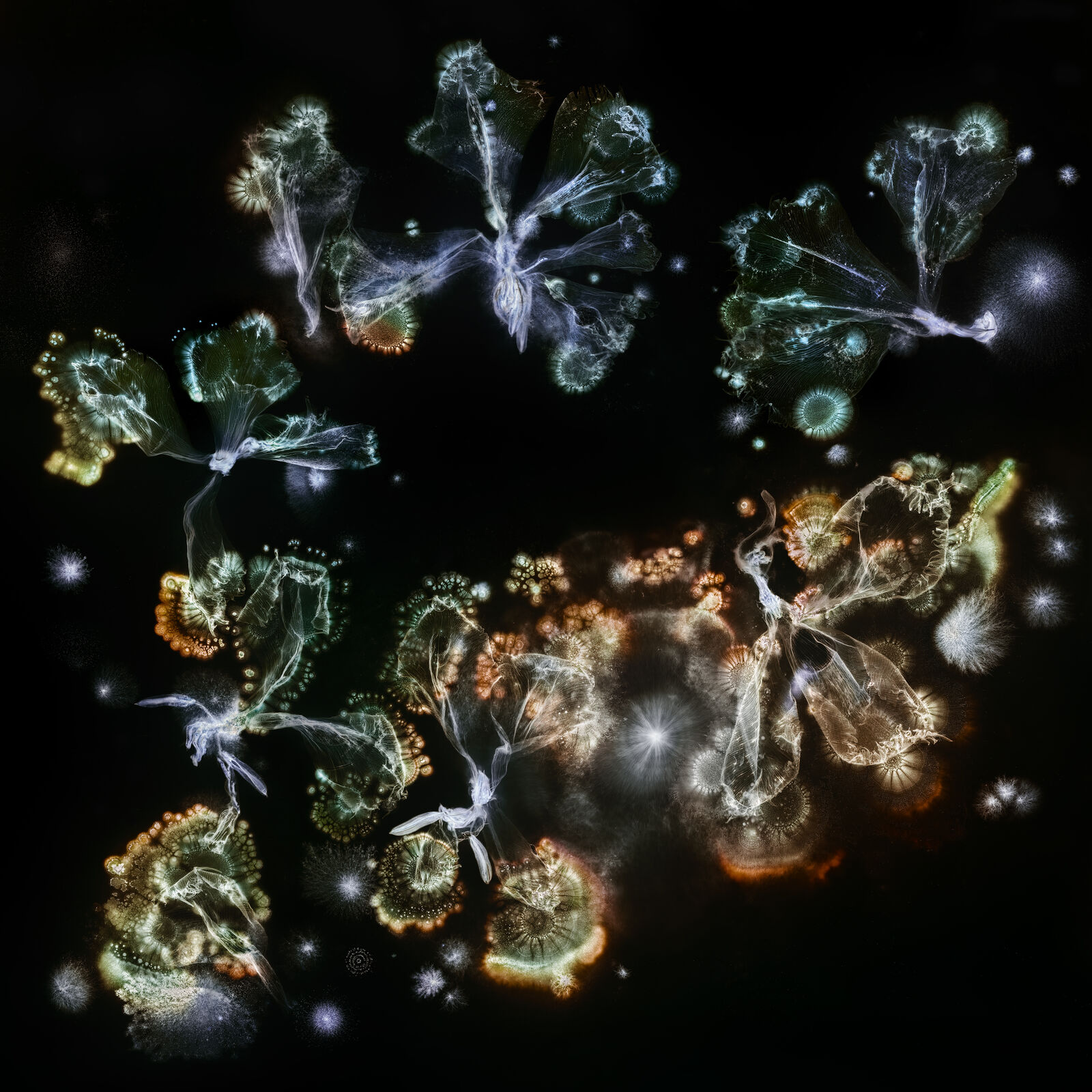 Bacterial cellulose curtain. Experiments: Bastian Beyer and Iva Rešetar (design), Skander Hathroubi (microbiology). Photo: Bastian Beyer, adapted by Ada Favaron. Project coordination: Elisabeth Obermeier & Franziska Wegener