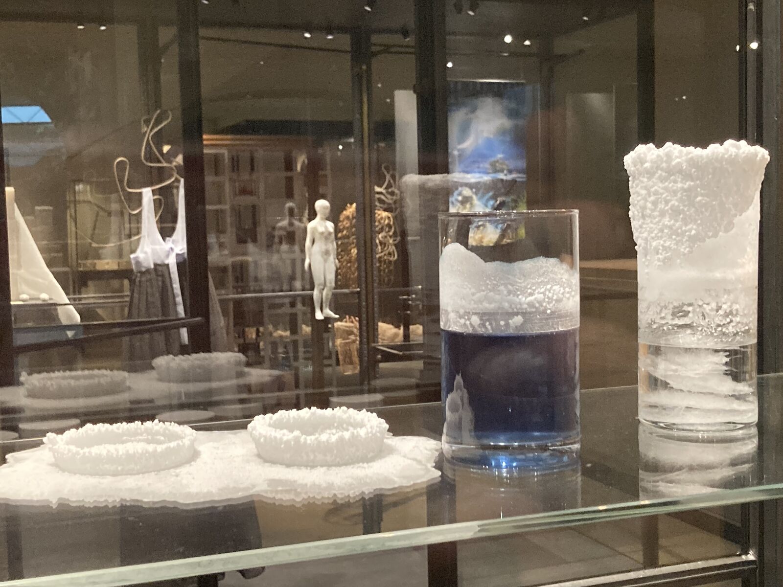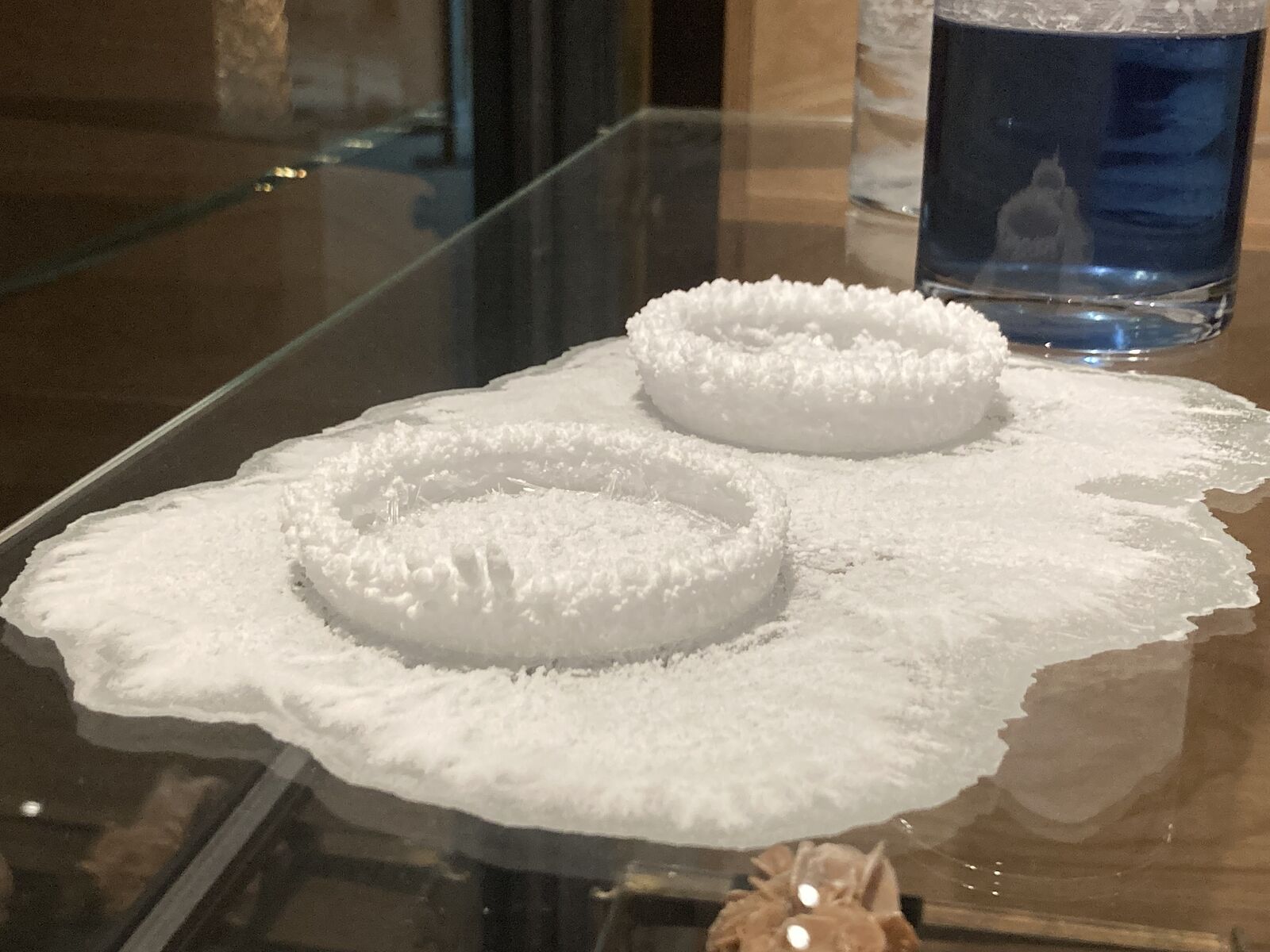 The installation »Auturgy of Carbamide« consisted of two glass cylinders and a petri dish filled with a urea solution. During the exhibition, crystals formed through evaporation: the material urea built crystalline sculptures without any further human intervention, thus referring to the self-activity of materials thematized in the exhibition. Organic urea occupies a special place in chemistry, as its artificial synthesis from inorganic raw materials in the laboratory in 1828 disproved the principle of vitalism, the idea that organic substances could only be produced by living things through so-called ›vital force‹. Following on from this, Dues' intervention questions the concept of a rigid separation between inanimate and animate nature and offers a fluid transition in opposition to it.
