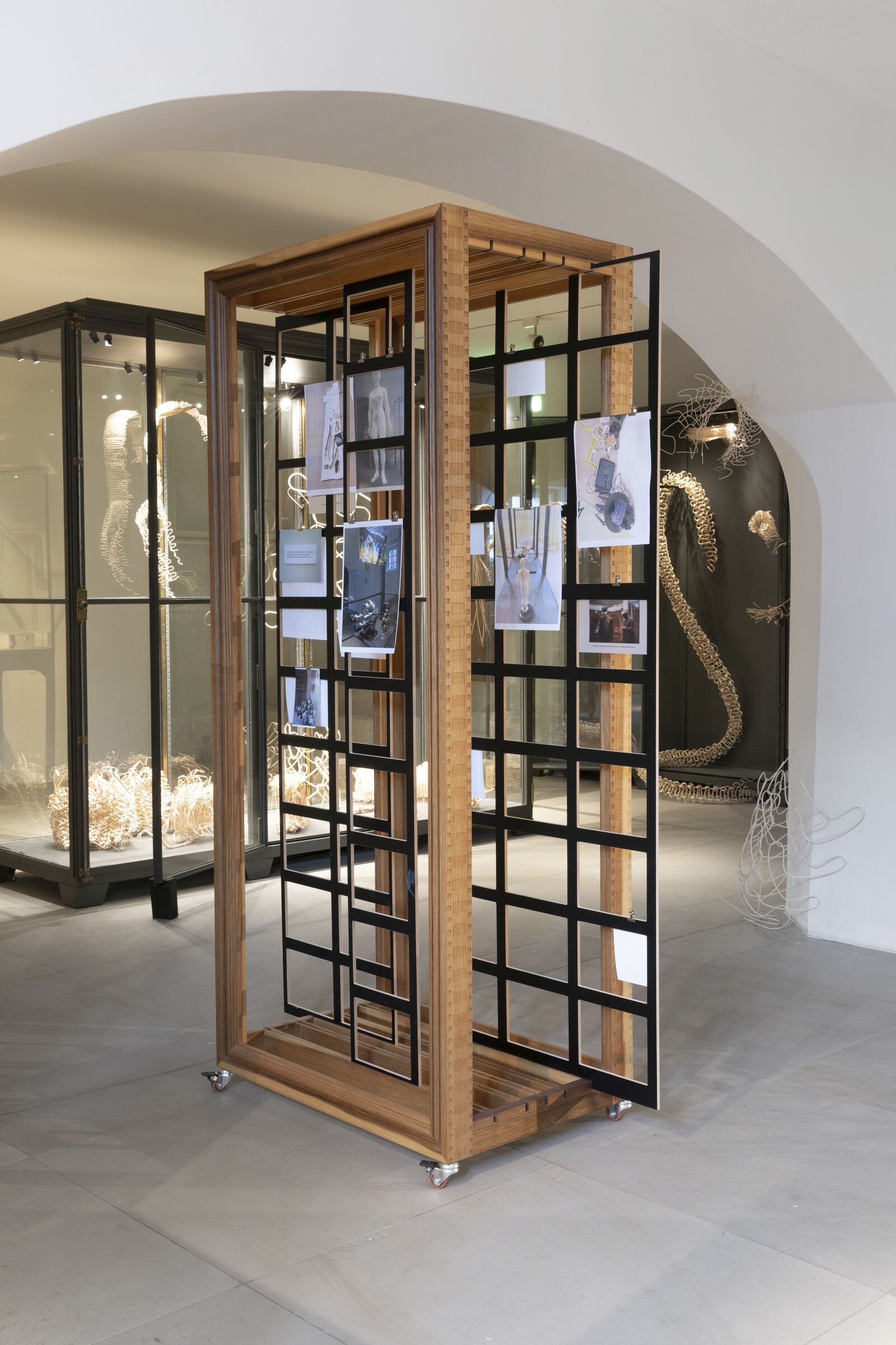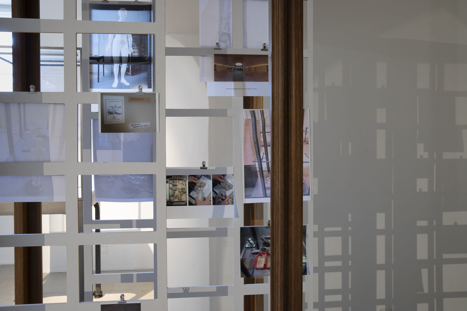 The artpiece »Device« of the Berlin artist Sabine Huzikiewiz operates between design and art, between commodity and object of observation. A double picture frame opens up an intermediate space in which pictures can be hung in a sliding manner on white or black grids. On the sides of the wooden frame runs a perforation similar to a 35-mm film strip, created with the help of a 3D program and a CNC milling machine. The multiple flexibilities of »Device« allows an open structure for working with images that can become visible and invisible next to and behind each other. As an apparatus for art historical research and as a collection piece, Device has now been relocated to the TAT exhibition space. For the exhibition »Stretching Materialities«, it is the mobile site of an exhibition documentation in transition, which can also be the site or starting point for performative situations in the TAT. In this sense, »Device« is an object that creates a milieu in which to act.
