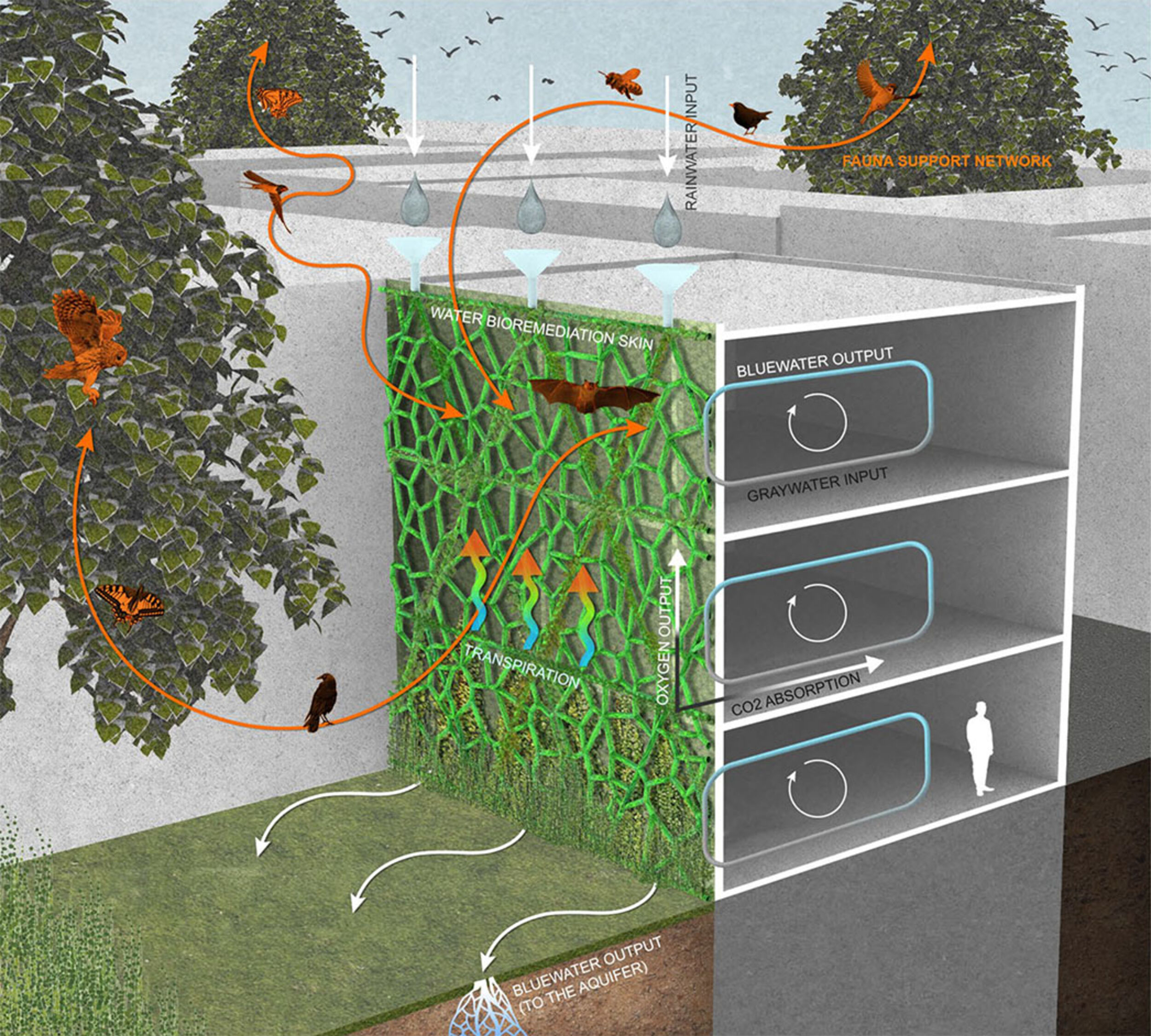 The actuator of the envelope is water, one of the most vital resources for the sustenance of ecosystemic activity. This approach requires the study of water related functions, properties and phenomena across different scales (macro- (urban fabric), meso- (building/device), micro-(study of microorganisms and properties of matter). With the use of dynamic design tools, the architectural design is formed by the dynamics and temporalities of water. Alliances between the fields of biotechnology, natural sciences and environmental engineering as well as humanities, landscape architecture, animal aided design and biomimetics are employed to incorporate biological growth and water treatment methods in an architectural design method that addresses the topic of co-habitation in contemporary cities, especially in the context of pressing climate related problems such as droughts, floods and the contamination of natural water resources.