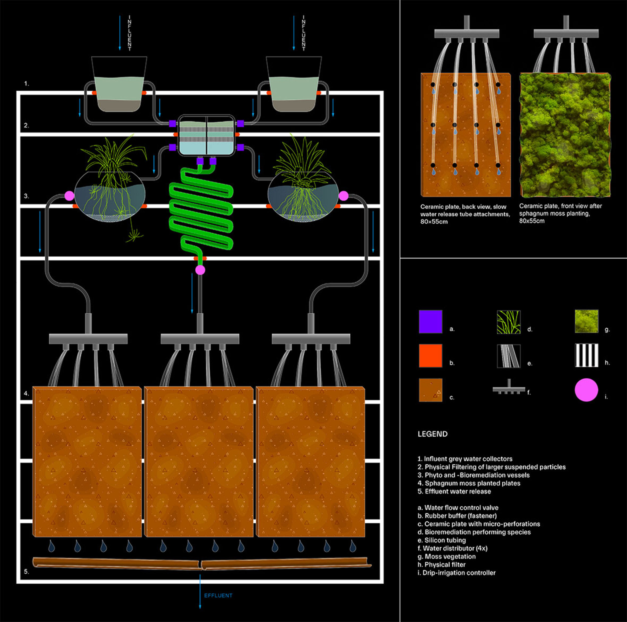 The aim of Dimitra’s research is to investigate emerging architectural design protocols of activating the building envelope with the treatment of water in order to restore and promote ecosystemic functions and local biodiversity. In this framework the building envelope is approached as a voluminous, programmatic and infrastructural space of opportunity for integrating the building into the metabolic processes of the ecosystem. The envelope is explored as a porous membrane rather than a barrier, a vehicle for mutually beneficial human and non-human symbiosis that allows for material and energy negotiations and exchanges between the outside and the inside. Therefore, the envelope is re-thought as a potential space of communing for all local species.